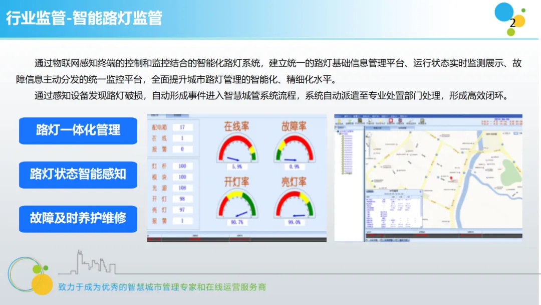 - 智能路灯监管:建立路灯基础信息平台,实时监测运行状态,故障自动上报、自动派遣,提升养护效率。
