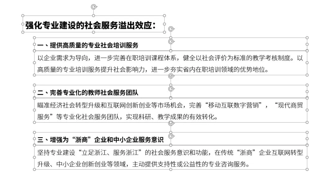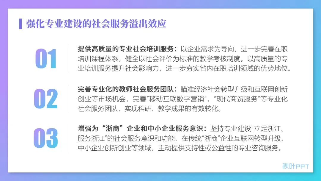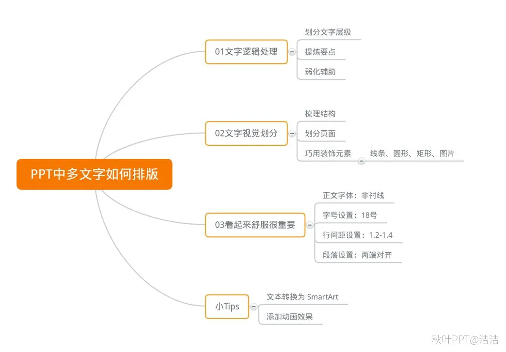 第一步:首先我们分析内容,把内容的层次梳理清楚后,才能明确页面的框架!哪些是重要的,哪些是只需要稍稍提到的。理清信息层次之后,需要用什么样的「视觉力度」,心里有就数啦。完成文字逻辑处理后,原来大段大段的文字,现在看起来是不是清晰多啦~第二步,按照文字的逻辑层级,进行视觉上的层级划分。这里我们复习一下排版的四大原则:对比、重复、对齐、亲密。简单却很容易被忽略的区分层次方法有:回车键分段、拆分文本框。在一个文本框内时,可以直接按回车键换行,操作方便。但如果只是在文本框内按回车,又会限制之后的美化操作,所以,我们只需要把文本框拆分成多个,就能灵活排版啦!信息架构组建完成后,我们可以开始考虑版式的布局和适当的设计美化。因为这段文字是一个大标题,随后三个小标题的段落。所以,我们放上最常规的标题+内容的竖版版式↓虽然这种版式比白底黑字的页面看起来清晰许多了,但版式过于生硬死板,没有什么新意。为了让画面丰富起来,我们可以利用线条、形状、图标等来进行页面的划分和强调。比如下面这张用数字+文字的排版,同时为页面增添渐变色矩形框以及小竖线来引导视线:在空白区域加上渐变圆形色块等来营造层次感,记得为卡片添加阴影哦!但整个页面中只有一些「色块元素」,还是单调了些。这时候我们可以寻找与主题相关的图片来加以修饰,让 PPT 更加出彩~发现了吗?除了用完整的图片做背景,我们可以用色块遮住图片局部,制造分屏的效果:厌倦了平平整整的矩形、圆形,也可以使用不规则的任意形状哟!看似复杂,但大致思路是不变的:先确定文字版式,再利用英文、线条、形状、图片等进行设计和美化。正文字多,字体最好选用非衬线字体,比如思源黑体,颜色设为深灰色,相对柔和一些。(美化大师插件可以批量修改 PPT 字体)行间距控制在 1.2-1.4 倍之间,具体操作:在开始选项卡中,点击段落组的行距选项命令,然后将行距改为多倍行距,数值控制在 1.2-1.4 之间。文字段落设置为两端对齐,这样段落的两侧会像刀削过一样整齐,看起来非常舒服。老板交给我们的任务经常又多又急,有没有能简便快捷实现图文排版的方法呢?有!那就是被大多数人所忽略的排版神器「SmartArt」。❶ 首先我们要在一个文本框内,点击【向右缩进】按钮调整文字层级。❷ 选中这个文本框,然后点击转化为 Smartart 中的任意版式,就可以一秒完成文字排版啦!觉得颜色不好看?我们还可以更改 Smartart 的配色!❸ 如果还想继续美化,我们可以给页面添加背景,调整 Smartart 版式中的文字大小等等~用「SmartArt 工具」,简单 3 步就可以搞定多文字排版啦!如果实在觉得页面文字太多太满,还可以添加动画效果哦!今天的知识点全在下面这张脑图里啦!保存下来慢慢消化~如果你想继续精进 PPT 技能,推荐你来体验下这个 3 天 PPT 集训营~每天只要学习大概 10 分钟,从日常的功能出发,全程演示,一课一练,夯实进阶每一步,既有干货知识,又能实操检验学习成果。为感谢一直以来各位小伙伴的支持, 秋叶 PPT 开设读者群啦! 欢迎大家 扫描下方二维码加入 哦!