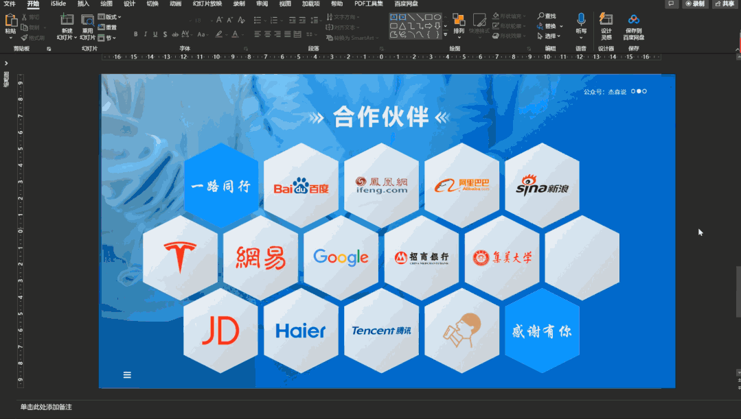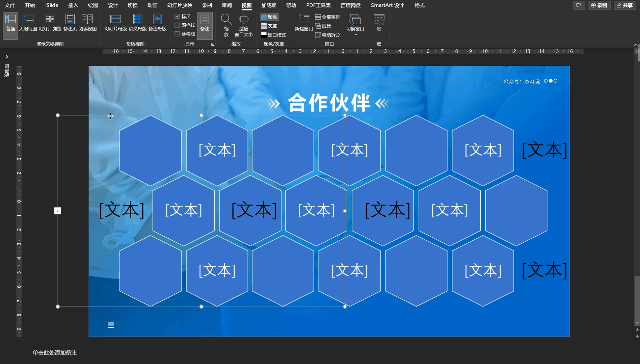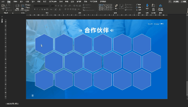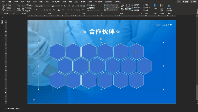 颜色填充并贴长 logo 之后一定要做「居中」操作,选中六边形和 logo 然后【排列】-对齐-水平居中/垂直居中,最后这么一页合作页就做好啦。