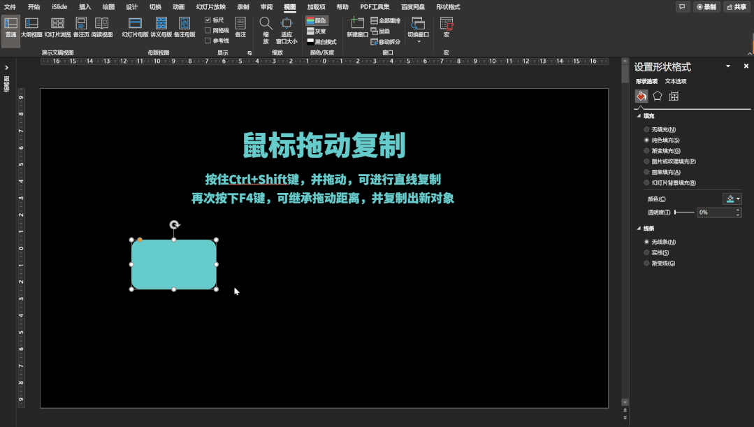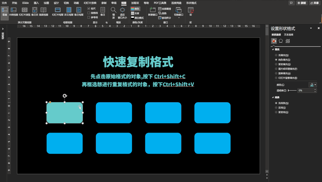 但如果后面打字、插入形状之类的操作之后,F4 就无法延续这些动作了。这时可以用【Ctrl+Shift+C】进行格式复制,再框选准备同类操作的,进行 【Ctrl+Shift+V】进行格式粘贴: