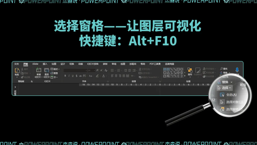 那么第二种情况,需要打开【选择窗格】,具体的路径在开始-选择,在下拉功能找到。或使用快捷键【Alt+F10】。