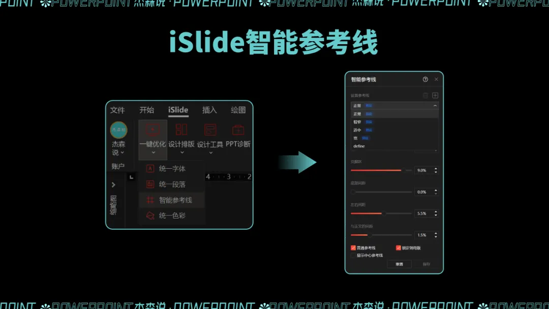 其实,在 iSlide 中,就内置了一些常用的参考线预设,点击 iSlide-一键优化-智能参考线,即可使用该功能。