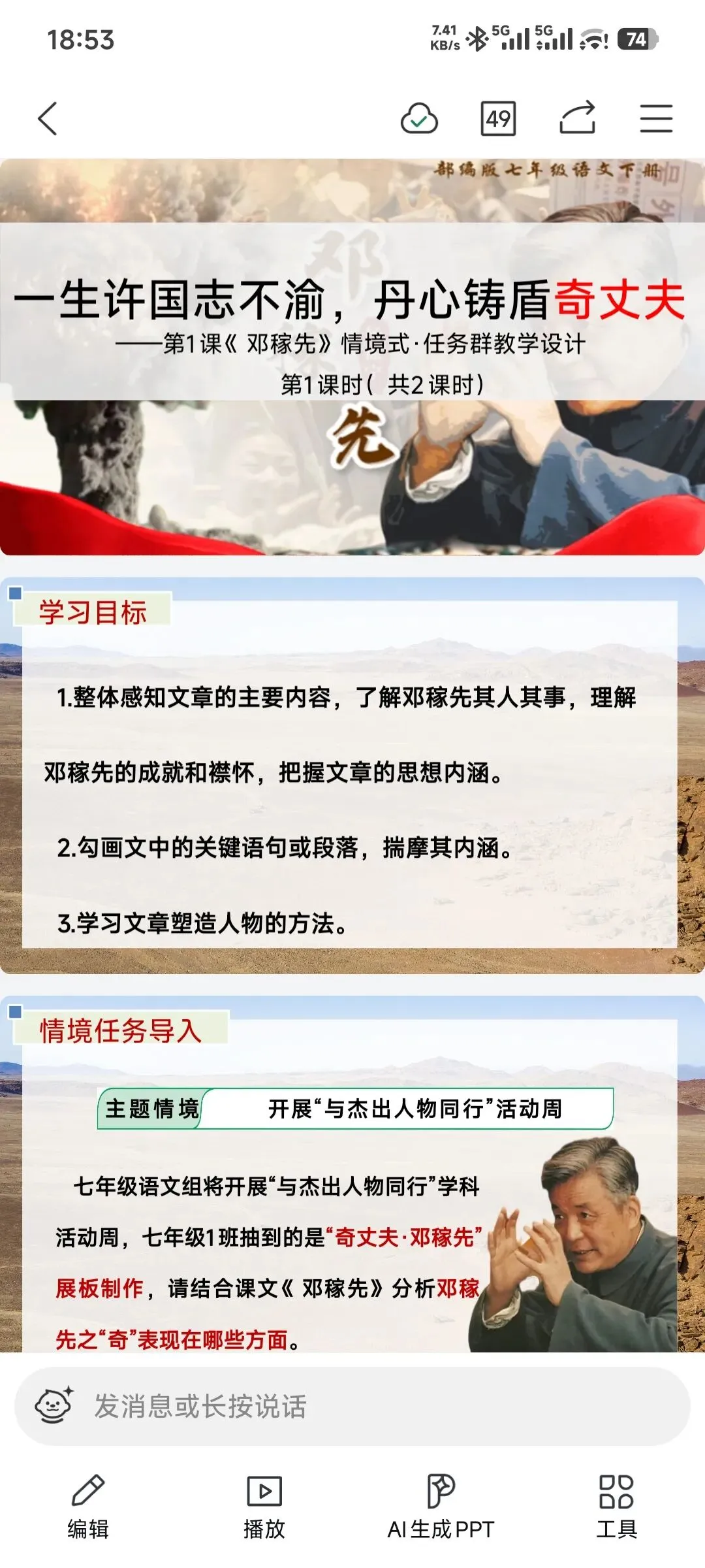 这个贯穿始终的情境设计,堪称本课最大的亮点。学生不再是单纯地"学习一篇课文",而是带着"策展人"的身份,为制作展板而深入研究邓稼先。