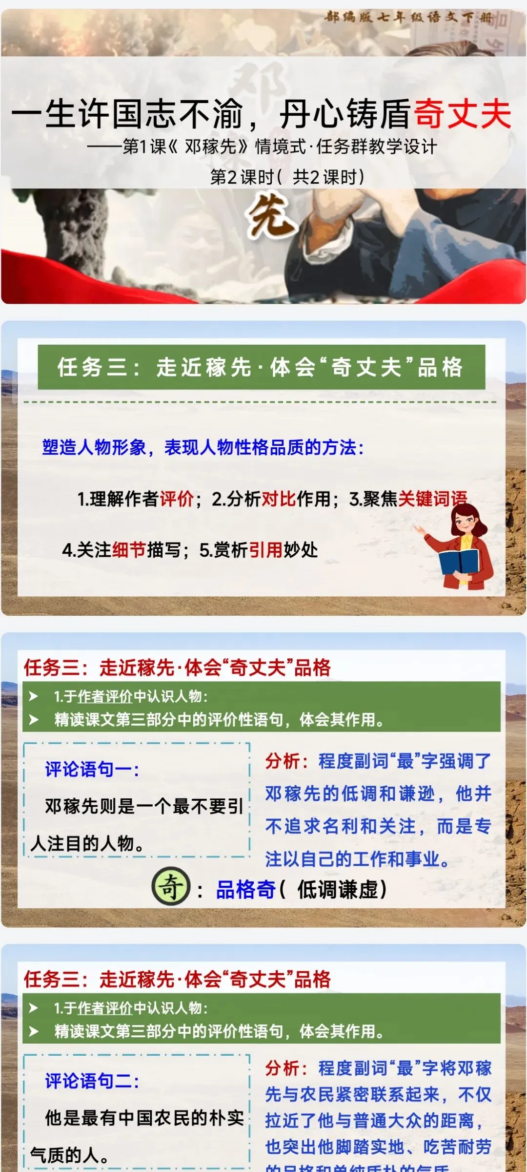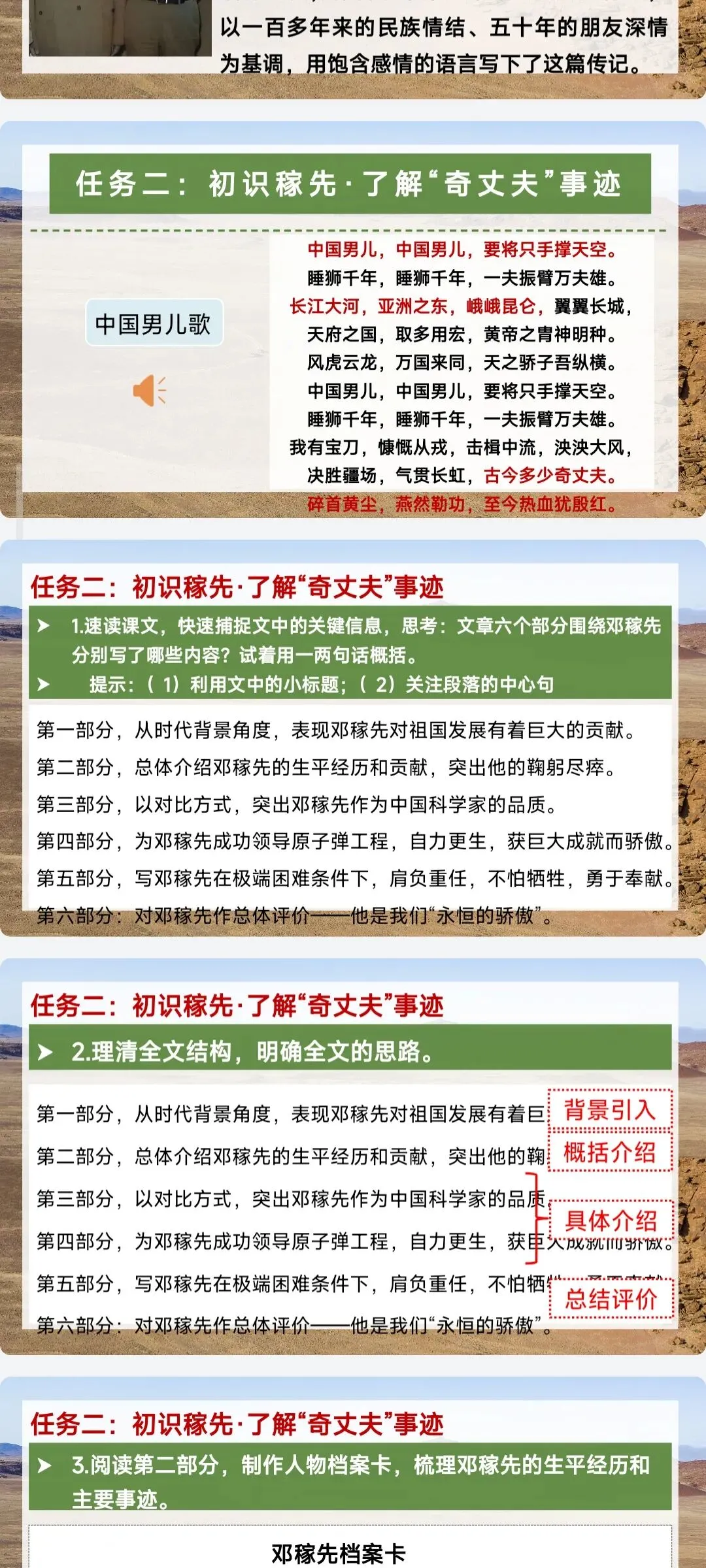 从"奇丈夫"展板制作的情境创设,到四个任务群的阶梯式推进;从多维度的形象分析,到情感的自然升华——每一步都在引导学生与邓稼先对话,与自己的内心对话。