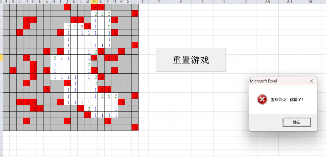 Option Explicit' API 函数声明:检测鼠标右键是否被按下(兼容 32/64 位 Excel)' 如果编译出错,请尝试删除 "PtrSafe" 关键字Private Declare PtrSafe Function GetAsyncKeyState Lib "user32" (ByVal vKey As Long) As IntegerPrivate Sub Worksheet_SelectionChange(ByVal Target As Range)' 检测右键是否被按下,如果是则忽略此次选中变化(由右键引起)If GetAsyncKeyState(vbKeyRButton) And &H8000 ThenExit SubEnd IfIf GameOver Then Exit SubIf Intersect(Target, Me.Range("A1:T20")) Is Nothing Then Exit SubApplication.EnableEvents = FalseDim row As Integer: row = Target.rowDim col As Integer: col = Target.Column' 加强边界检查If row < 1 Or row > GRID_SIZE Or col < 1 Or col > GRID_SIZE ThenApplication.EnableEvents = TrueExit SubEnd If' 首次点击保护If Not FirstClick Then' 确保Mines数组已初始化If Not IsArrayInitialized(Mines) ThenInitializeGameEnd If' 如果首次点击是地雷,重新生成布局If Mines(row, col) ThenInitializeGame row, colEnd IfFirstClick = TrueEnd IfIf Not Revealed(row, col) And Not Marked(row, col) ThenIf Mines(row, col) ThenGameLostElseRevealCell row, colCheckWinEnd IfEnd If' 安全取消选中On Error Resume NextMe.Range("A11").SelectApplication.EnableEvents = TrueEnd Sub' ========== 鼠标右键标记地雷 ==========Private Sub Worksheet_BeforeRightClick(ByVal Target As Range, Cancel As Boolean)' 阻止默认右键菜单弹出Cancel = True' 仅当游戏已开始且未结束时,才执行标记/取消标记If FirstClick And Not GameOver Then' 仅处理游戏区域内的单元格If Intersect(Target, Me.Range("A1:T20")) Is Nothing Then Exit SubDim row As Integer: row = Target.RowDim col As Integer: col = Target.Column' 边界检查If row < 1 Or row > GRID_SIZE Or col < 1 Or col > GRID_SIZE Then Exit Sub' 已揭开的格子不能标记If Revealed(row, col) Then Exit Sub' 切换标记状态(禁止事件触发,避免循环)Application.EnableEvents = FalseIf Marked(row, col) Then' 取消标记:恢复灰色背景,清空内容Marked(row, col) = FalseWith Me.Cells(row, col).ClearContents.Interior.Color = RGB(192, 192, 192)End WithElse' 添加标记:显示“P”并设为黄色背景Marked(row, col) = TrueWith Me.Cells(row, col).Value = "P" ' 可替换为旗帜符号如 "⚑".Interior.Color = RGB(255, 255, 0) ' 黄色背景.Font.Color = RGB(0, 0, 0)End WithEnd IfApplication.EnableEvents = TrueEnd IfEnd Sub' ========== 右键标记结束 ==========' 辅助函数:检查数组初始化状态Private Function IsArrayInitialized(arr As Variant) As BooleanOn Error Resume NextIsArrayInitialized = IsArray(arr) And _Not IsError(LBound(arr, 1)) And _UBound(arr, 1) >= LBound(arr, 1)End Function