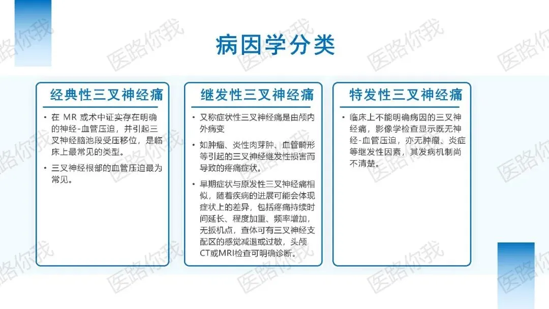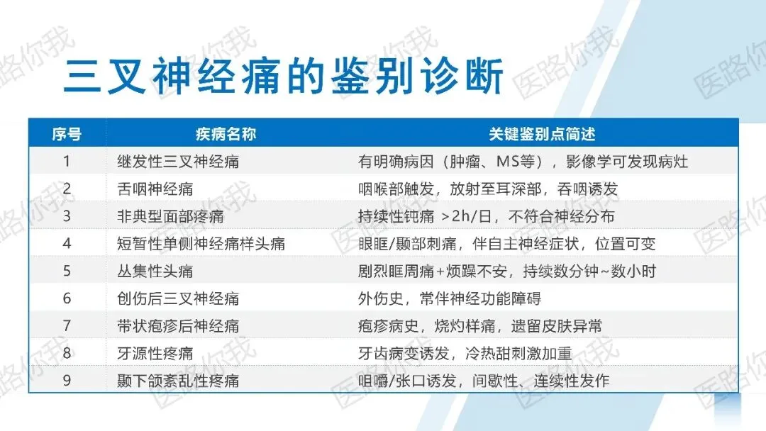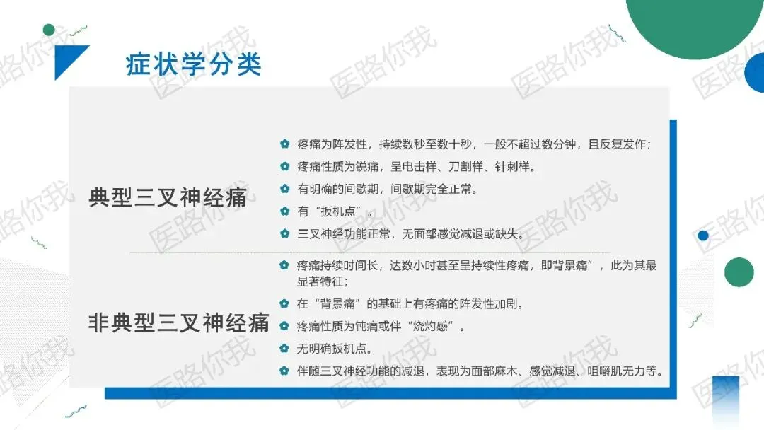 非典型三叉神经痛:表现为持续性钝痛或烧灼感,无明确扳机点,常伴面部麻木或感觉减退。此类患者手术效果相对较差,需慎重评估。
