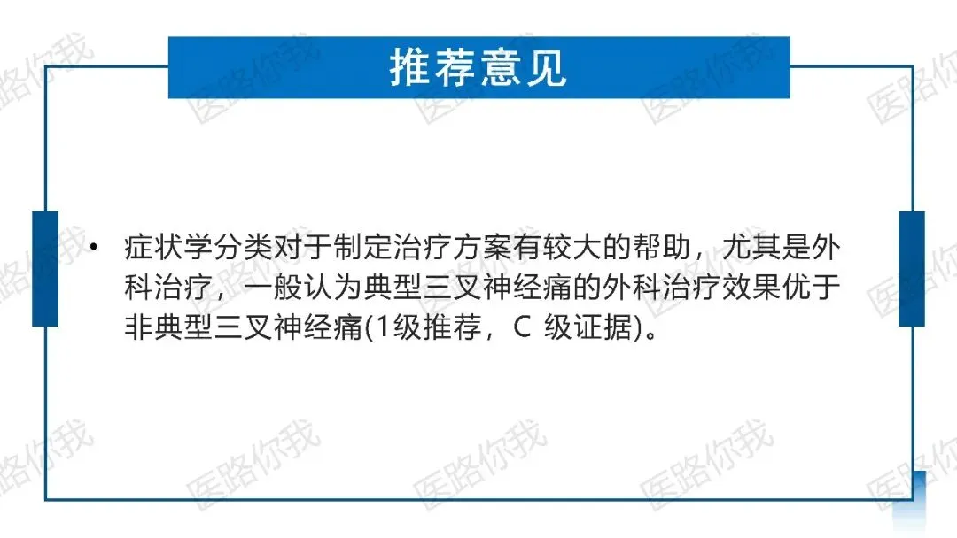 典型三叉神经痛:表现为阵发性锐痛(电击样、刀割样),有明确的“扳机点”,间歇期完全无痛,面部感觉正常。此类患者外科治疗效果最佳(1级推荐,C级证据)。