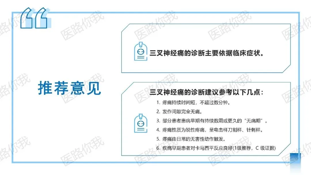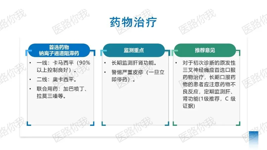 对于初次确诊的原发性三叉神经痛,指南依然坚持“药物优先”原则,但明确了药物的局限性和监测要求。