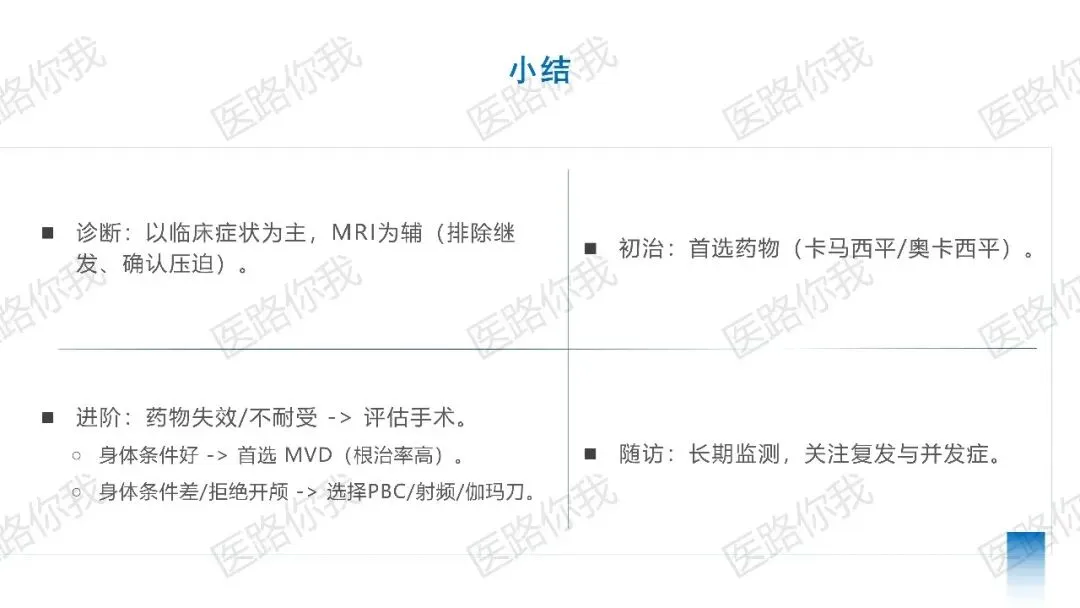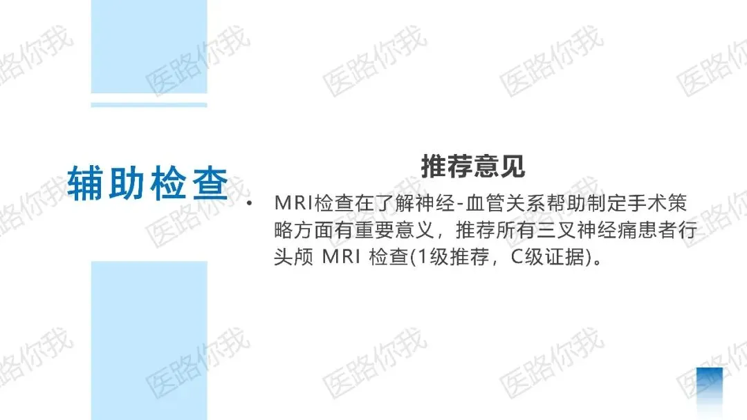 无论何种类型,头颅MRI检查是“必选项”。指南强烈推荐所有患者行MRI检查(1级推荐),以明确是否存在神经-血管压迫,并排除肿瘤等继发性因素。