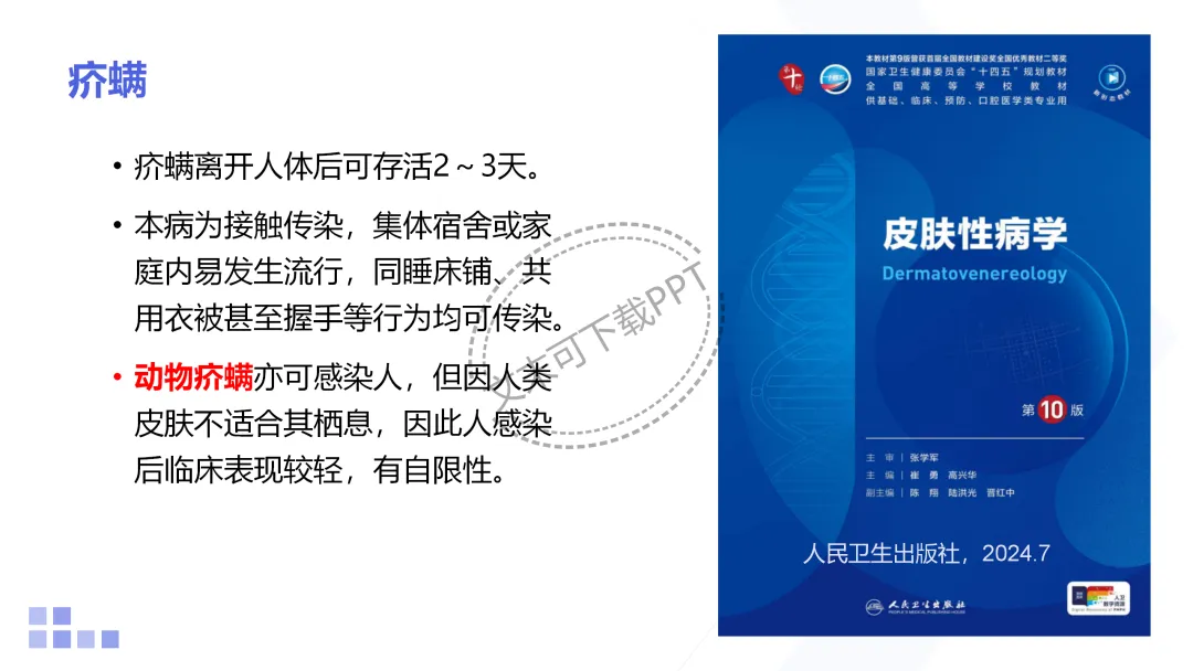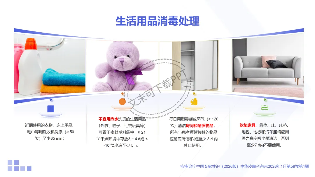 >【PPT】普通疥疮握手、拥抱一般不会引起感染;衣物、被褥或日常用品间接传播的可能性较小;疥疮诊疗中国专家共识(2026版)