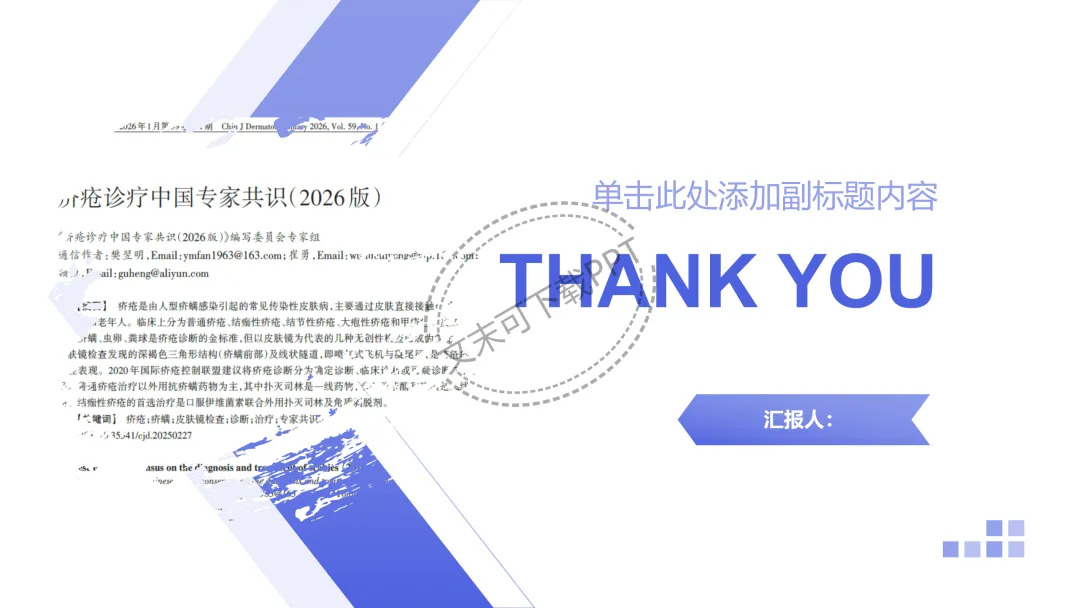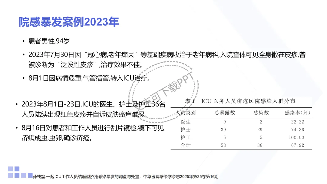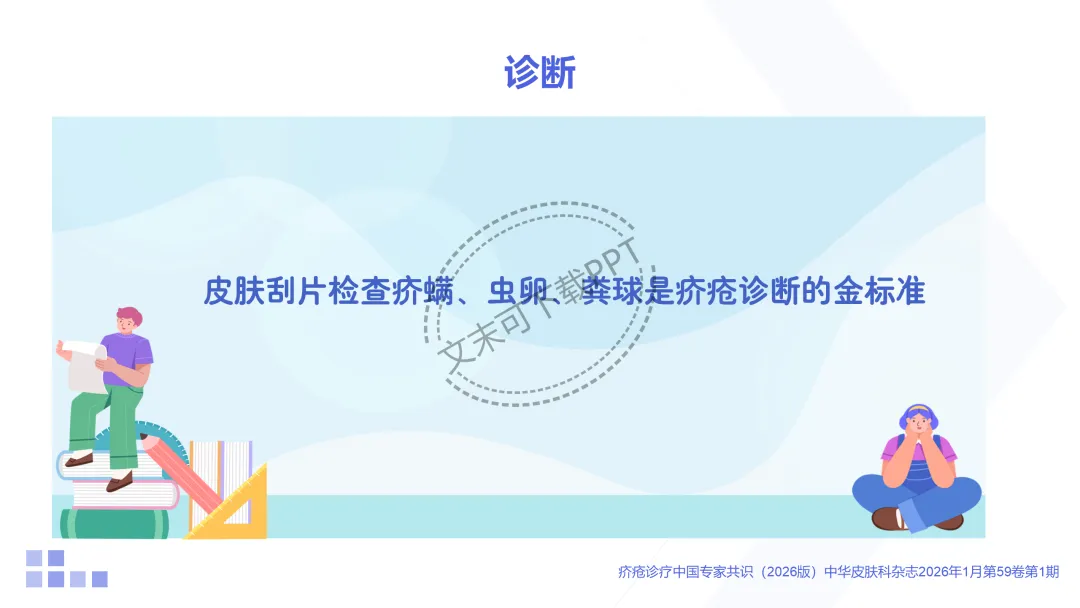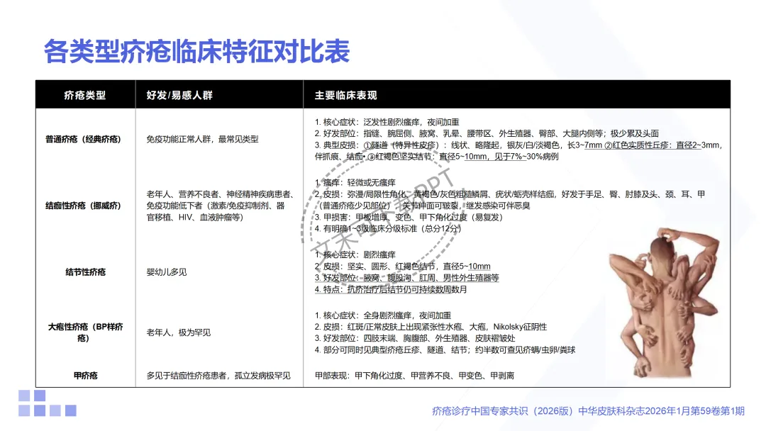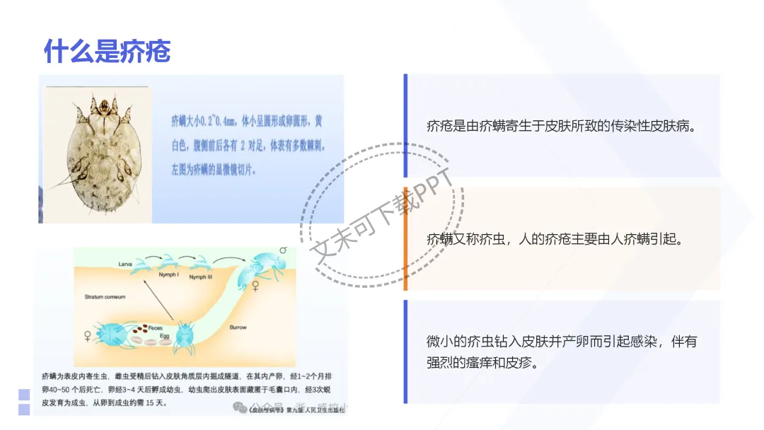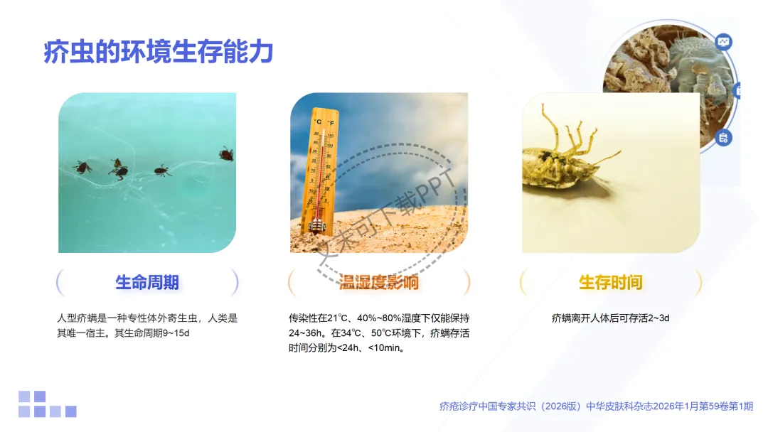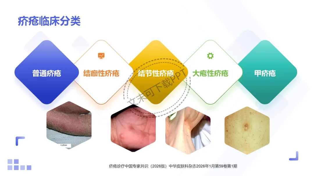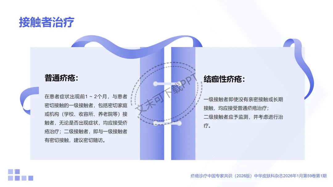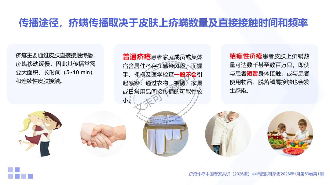 【PPT】普通疥疮握手、拥抱一般不会引起感染;衣物、被褥或日常用品间接传播的可能性较小;疥疮诊疗中国专家共识(2026版)