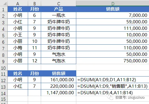 dsum函数在进行求和时,多个列条件执行的是且操作,如C12单元格,计算小明在9月份的销售额;多个行条件执行或操作,如C13单元格计算小明在9月份和小红在7月份的销售额 之和;若要对数据库中的一个完整列执行操作,请在条件区域中的列标签下方加入一个空行。就像示例中C14单元格的公式,因为列方向是与条件,而行方向是或条件,所以最终计算所有人的销售额。