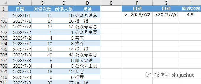 如果要查找日期在2023年7月2日(含)之后,2023年7月6日之前的阅读量合计,输入的函数公式为“=DSUM(A1:D877,"阅读次数",F1:G2)”。此处,数据区域和标题单元格和案例中的用法相同,条件区域的日期用大于小于等于号做出判断,最后返回结果为429,即两个日期之间所有的阅读量之和。