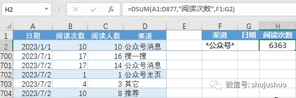 查找渠道中公众号消息和公众号主页 的阅读量之和,H2单元格公式“=DSUM(A1:D877,"阅读次数",F1:G2)”,条件区域使用关键词“公众号”加上通配符*,即可计算出准确的结果,此处日期字段下的空值,表示所有日期都参与求和计算。