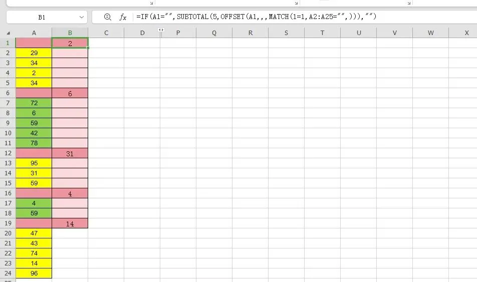 在A列有很多不连续的数字,这只是很少一部分,现在需要把每一段连续的数字区域中的最小值放到第一个空白单元格中。不能改变表格的结构,该如何处理。要得出连续区域中数字的最小值,最小值我们可以用MIN函数,但是这里的区域是不固定的,直接用MIN很难达到想要的结果。这里,我们发现一个规律,就是连续区域中数字的最小值,不就是每两个空白单元格之间的区域中数字的最小值。这里的难点就是如何动态地得出两个空白单元格之间的连续区域了。直接用IF来判断,如果A列单元格不为空,就让B列等于空,否则,就用OFFSET函数返回两个空白单元格之间的连续区域,然后求出这段连续区域的最小值,因为这里的数组涉及多重引用了,直接交给MIN函数,他没有这个能力来处理,我们知道SUBTOTAL这个函数正好有这个功能,完全符合我们的需要。公式如下:=IF(A1="",SUBTOTAL(5,OFFSET(A1,,,MATCH(1=1,A2:A25="",))),"")有些朋友第一次看到1=1,1=2很奇怪,1=1,1=2啥意思,难道1还不等于1?1当然等于1,1也当然不等于2,我们这里不是数学问题,是逻辑问题,这里是一个套路,是要得到一个我们需要的逻辑值,TRUE或FALSE,用于MATCH的第一个参数。MATCH的第二个参数,是A2:A25="",注意公式是写在B1单元格,A2:A25=""是从A2开始,注意单元格的错位。A2:A25=""得到一列逻辑值,等于空的,返回TRUE,不等于空的,返回FALSE,然后,用MATCH精确查找第一个TRUE的位置,再传递给OFFSET函数,作为OFFSET第4个参数,正好得到第一个非空,到第一个空白区域之间的高度,然后公式下拉,完美解决问题。小伙伴们 ,刚开始写公式的时候,遇见复杂的问题,肯能会不明白,或者不理解,大家要多练习,多按F9键来拆解公式的运算过程,就会慢慢的理解和灵活运用。好了,今天就分享到这,有什么不懂的,或在工作中遇到的实际问题,都可以打到留言区,我们一起搞定!