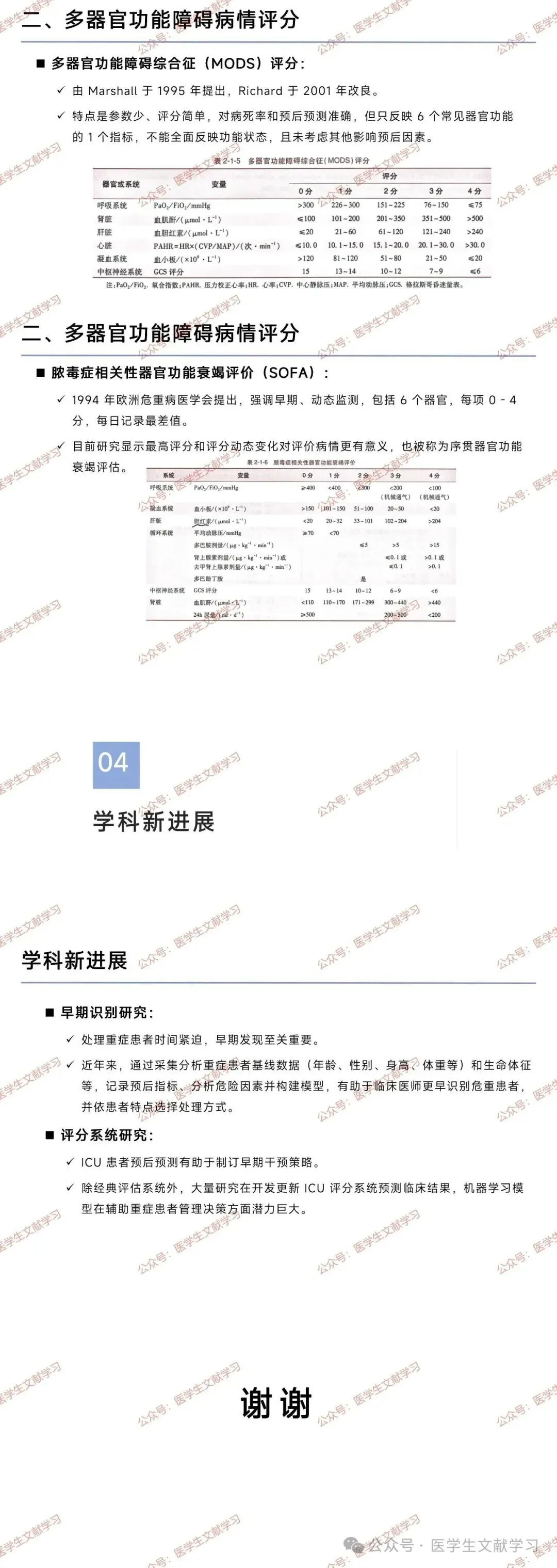 由 Marshall 于 1995 年提出,Richard 于 2001 年改良,参数少、评分简单,对病死率和预后预测准确,但只反映 6 个常见器官功能的 1 个指标,未考虑其他影响预后因素。
