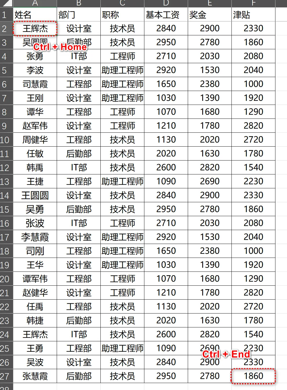 1. Ctrl + Home(跳转到数据左上角)、Ctrl + End(跳转到数据右下角)