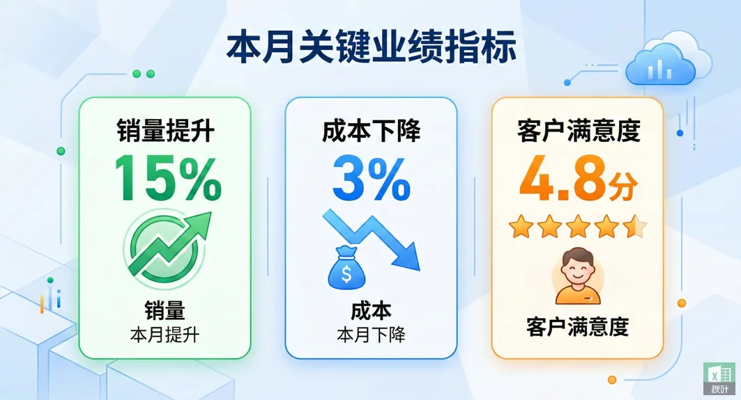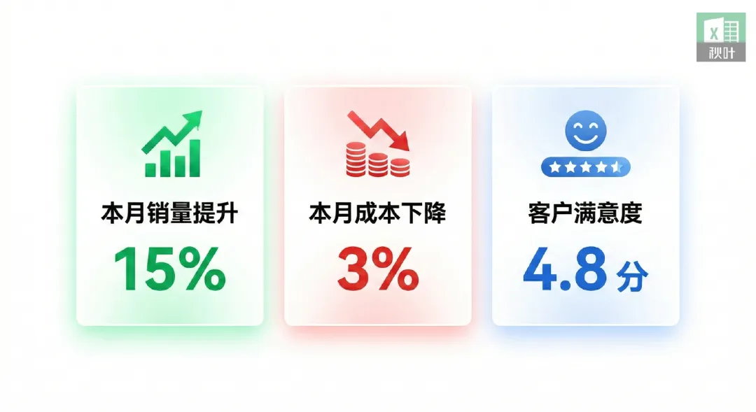 “本月销量提升 15%,成本下降 3%,客户满意度 4.8 分”