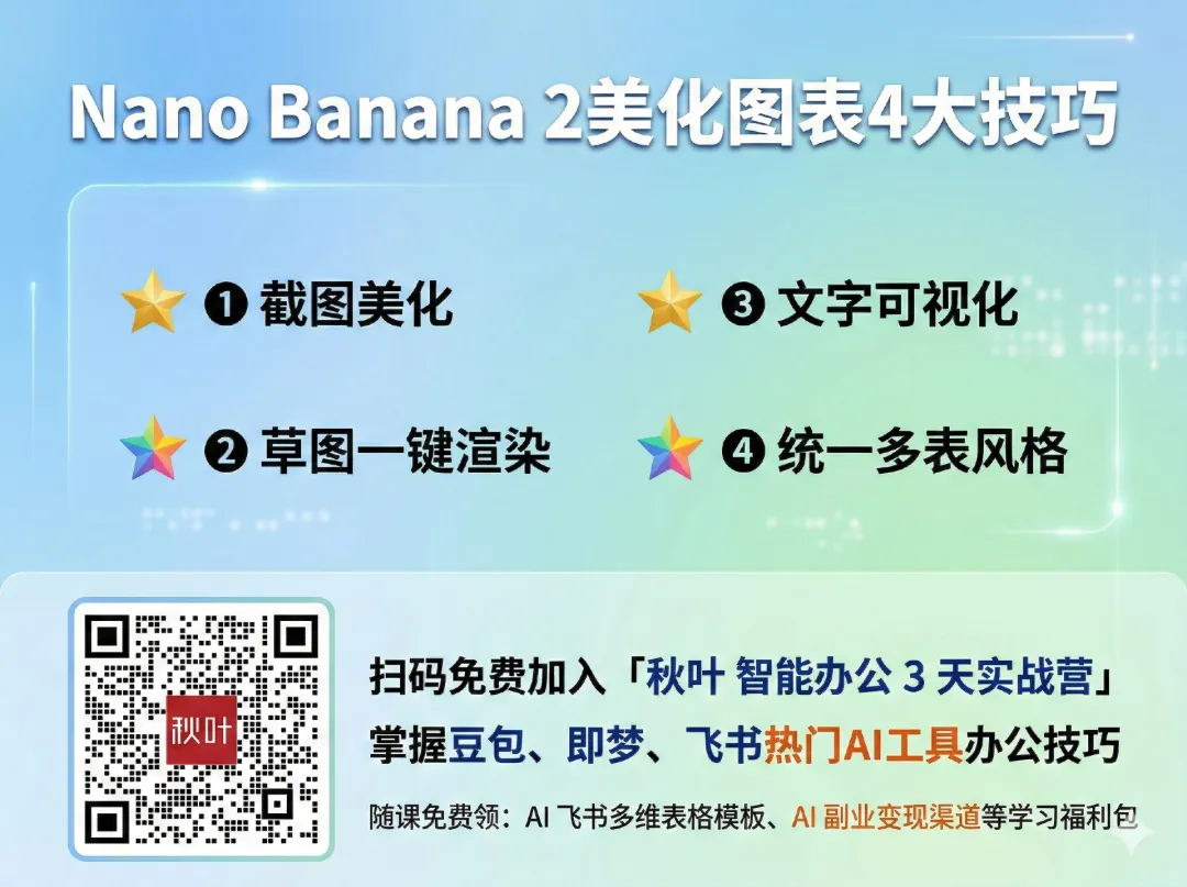最近,备受期待的 AI 作图工具 Nano Banana 2 终于正式上线了!大家都把它用来画插画、做海报、做 PPT,讨论度非常高。但是,作为经常和数据打交道的人,我发现它竟然隐藏着一个超级实用的小众用法:一键美化 Excel 数据图表!对比来看,AI 处理后的图表不仅保留了原始数据的准确性,视觉上的美观度也得到了大幅提升。真的,美化图表这种重复且耗时的视觉工作,我们完全可以直接交给 AI 来做。所以今天,我就给大家分享 4 个非常实用的图表美化技巧,带你快速上手 Nano Banana 2 这个新工具,提高工作效率:Excel 默认生成的图表,配色老旧,看着就不高级。别在 Excel 里调来调去了,直接截图,发给 Nano Banana 2,让 AI 帮你一键美化!❶ 截图你做好的 Excel 默认图表。比如下图:❷ 把图片上传给 Nano Banana 2(可以点击左下角的加号+上传,或者直接按【Ctrl+C/V】复制粘贴到对话框中)。美化图表,科技大屏风。深色背景、霓虹渐变、光效线条,适合数据大屏、PPT 压轴展示。除了科技大屏风,我们还可以用它生成简约商务风、财报专业风、质感磨砂风等多种风格的图表。为了帮助大家更好地使用 Nano Banana 2,我们特地准备了 10 个图表美化提示词,文末可免费领取~顾名思义,就是把你在纸上或其他地方手绘的草图,通过 AI 直接变成数据图表。比如我随手在纸上画了一个饼图,展示公司某款产品的用户性别占比。现在想要把它变成电子图表,Nano Banana 2 可以轻松搞定。将这张手绘草图转化为专业的矢量风格数据图表。保持原有的逻辑结构,将线条处理得平滑规整,文字清晰化。配色采用科技感风格(黑底荧光色)。作图、美化一步到位,甚至都不用在 Excel 里做初始图表了!有时数据量太少,撑不起一个 Excel 图表(比如只有 3 个核心指标),只写文字又冲击力不够。“本月销量提升 15%,成本下降 3%,客户满意度 4.8 分”生成图表,仅包含以上 3 个关键指标,禁止添加任何未提供的内容。包含三个关键指标的读数,为每个指标搭配合适的图标,字体醒目。很多时候一张报告里需要放多张表格,表格的来源呢,有的是你自己做的、有的是同事发来的、还有的是系统导出的,放在一起,各式各样的风格,让报告看起来很乱。所以,我们可以利用 Nano Banana 2,统一图表风格。❶ 找一张你满意的图表截图作为参考图。比如下面这张:严格参考【图1】的配色方案、字体大小和图表质感,重新绘制【图2】的数据内容,让两张图在视觉上看起来完全属于同一个系列。不需要手动一个个去调整,Nano Banana 2 快速帮你搞定。作为 Excel 用户,我们一直引以为傲的是处理数据的逻辑能力。Excel 负责数据逻辑,AI 负责数据可视化,掌握这套组合拳,就能发挥出 1+1>2 的效果。不过,如果你不想只学会一个画图工具,而是想系统掌握 AI 技能,那我强烈建议你加入《秋叶 AI 智能办公 3 天实战营》。在这里,跟着秋叶实战派导师 @AI陈,你可以学到:用豆包快速搞定各种工作文案;用飞书多维表格搭建动态数据看板;用即梦设计高级感海报、配图;用扣子定制专属智能体……