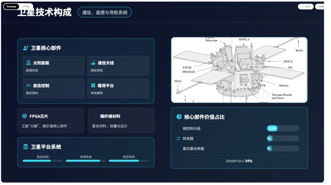 A. 整体风格基调 (Global Style)提示词: 极简科技风格 (Minimalist Tech Style),纯白背景,遵循 30% 主色(藏蓝色)+ 60% 白色+ 10% 搭配色(浅蓝色蓝/绿)的用色比例 。视觉观感清爽、通透,强调空间3D感。B. 介绍原理及方法论 (Logic & Methodology)用于流程图、循环图、逻辑推导等场景。提示词:- 布局: 三段式水平布局或 环形流转布局。- 元素: 扁平化圆角矩形容器,无边框或极细边框。- 逻辑线: 细长且带箭头的渐变橙色连接线,转角平滑。 风格: 逻辑节点使用半透明磨砂玻璃质感,突出重点步骤 。C. 介绍卫星通信/硬件设备 (Physical Entities & Hardware)用于展示具体产品、设备快照或硬件布局。提示词: > * 视觉: 宏观写实视角,3D 机械结构 特写视角 ,还原真实质感。 * 排版: 全局式散点布局,设备位于中心或侧方,侧边延伸出极简细实线作为引线。 * 标签:引线末端连接加粗的深灰色标题文字及浅灰色详细描述 。D. 数据展示与统计 (Data Visualization)用于展示趋势、对比及市场份额。提示词: > * 柱状图: 蓝色渐变填充,顶部圆角处理,上方标注具体数值 。 * 折线图: 使用平滑的 Spline 曲线,线条粗细适中,颜色对比明显。- 坐标轴: 隐藏冗余的背景网格线,仅保留底线。E. 字体与文字层级 (Typography)提示词: > * 标题: 24pt+ 微软雅黑,深灰色 (#333333),加粗。 * 正文: 12-14pt 微软雅黑/Arial,中灰色 (#666666),行间距 1.5 倍 ()()()()。 * 编号: 使用大号蓝色数字作为视觉锚点。