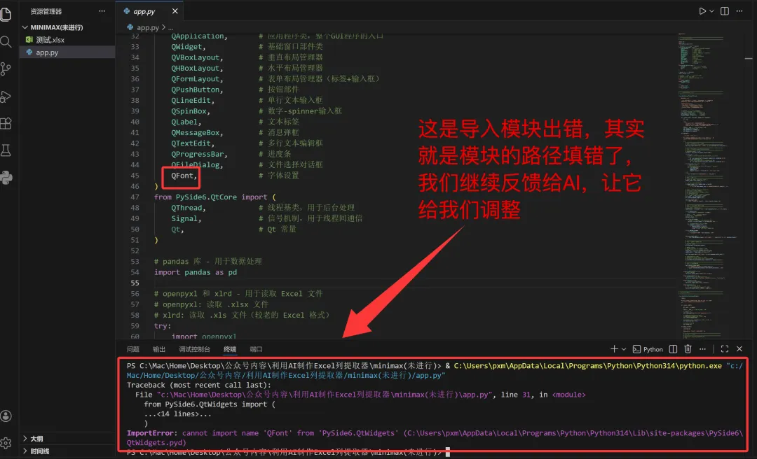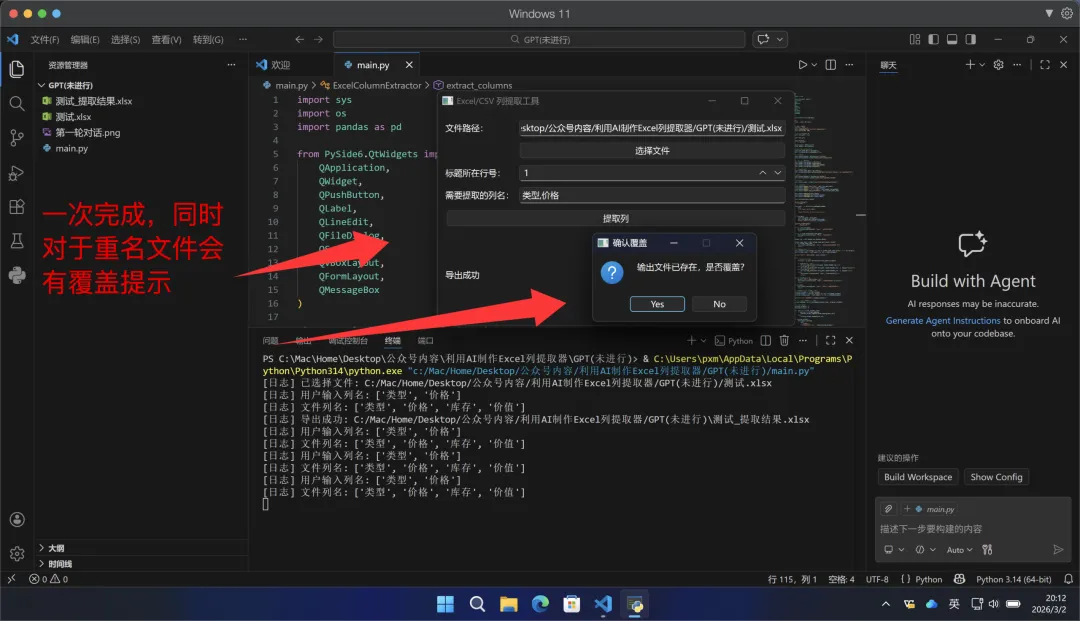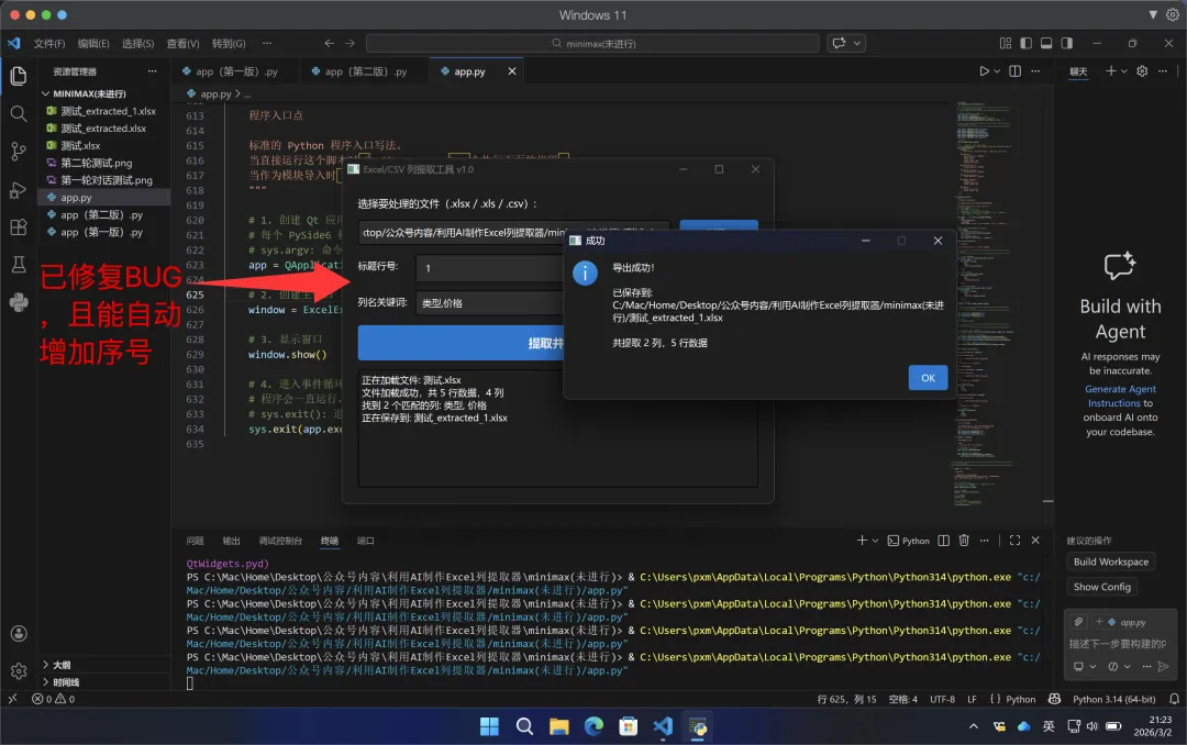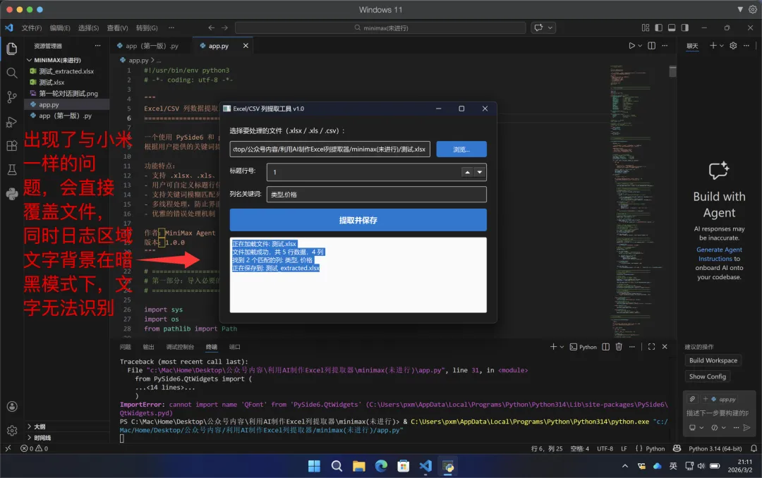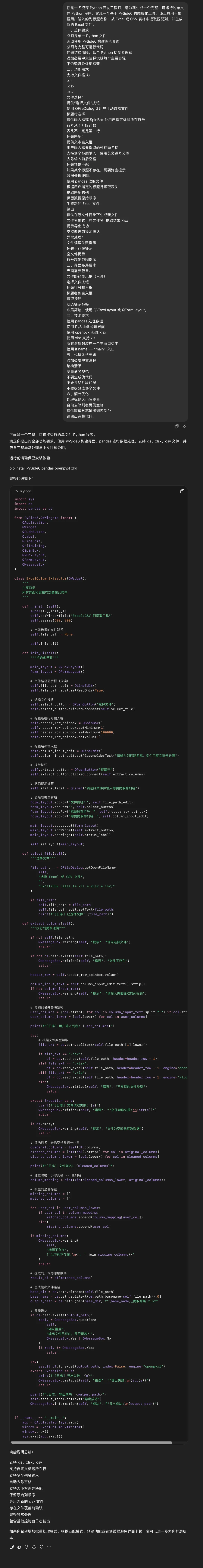 GPT:一次性通过,完成任务,由于任务已完成,不需要做额外BUG修复,故暂时没有接下来的对话,同时对于重名文件,有弹窗提示是否进行覆盖。质谱:测试失败,连续2次修复BUG,均为成功,所以不可用❌。minimax:第一次因为导入模块存在错误,故多了一次修复,第二次出现了与小米mimo一样的问题,文件覆盖和日志区域背景颜色未跟随系统的问题。 注意:本次所用的AI,均为网页版AI,总的来说除了质谱与小米未完成外,其他的都成功完成任务。 一次就完成任务,同时对于重名文件,带的有弹窗提示,故算完成。 智谱在本测试任务中未能成功完成,可能与模型的调教有关,想看过程的,可以在云盘(https://pan.baidu.com/s/1gcgadXiZGQExVGjoL5O8HA?pwd=kpmf )分享中看,我们看一下minimax输出的: 说明一下,由于minimax是agent模式:所以输出很多,截图大家查看很不方便, 所以我这里直接把minimax的分享链接发出来,大家可以直接参考一下:https://agent.minimaxi.com/share/372326255608348?chat_type=2 现在不知道大家看完了我用AI做的同一个项目,觉得怎么样,其实挺简单的,效果比较好的AI,一次对话就可以解决我们的问题,即使是效果差了一点的也最多就是3次修复而已,效率其实非常高,而且大家只要能够把自己的问题描述清楚,然后按照我的过程向AI提问,就可以正常解决了。 总的来说,就是自己一定要把自己现在遇到了什么问题,自己是否有解决思路,如果有思路,自己向AI提问,如果没有思路,那么就直接用笨办法,比如excel问题,你直接描述现在我的A2单元格有XX,B3单元格有XX,现在需要获得XXX结果,你有什么解决办法? 咱问题描述不清楚,那就直接有啥就发给它,同时最终要获得什么,发给它,如果说有些问题,实在是说不了,那么就截图发给AI,现在的AI基本都是支持发送图片的。 其实我发的这些很简单,也希望给大家一点点希望,这个东西真的很简单,没有难度,并不需要你写代码,只要你能够对问题进行总结,将问题向AI提问,AI就能够给你提供解决方案,而且如果你说工作生活中感觉有些问题太白痴,不好意思去询问,没关系,AI不是人,直接问,在白痴的问题,AI都会一本正经的给你说明你要怎么操作,当然在做工具的时候,一定要注意,在设计方案时,要提醒AI在进行文件覆盖、数据删除时,一定要谨慎,向我这几次情况下,有好几次,都存在覆盖生成文件的情况,如果恰巧文件名和你的某些文件一样,那么这是及其危险的操作,一定要注意。当然也不是说,因为有风险就什么都不敢去做,还是要大胆操作,要有去尝试的勇气,一定要记住,看文章,看视频,看教程,看的再多,自己不去尝试,一样等于0,只有自己去实践做一遍,才知道问题在哪,当你做几遍,你就会发现搞一个自己需要的定制小软件,真的很简单!! 在这里祝大家在2026年,能够找到属于自己的使用AI的最适合方法,我的这些东西也都是我自己在自己使用中,自己总结出来的东西,并不一定是对的,只能说是适合我的,大家也可以尝试一下,试试就能找到属于自己的方法了。入门的过程已经结束,大家看完这几篇,而且能够搞出来,那其实也已经算是开始踏入门槛了,至少你已经认识了VScode、Python只是现在还只能跟着走,还不清楚这俩东西还有什么用而已,慢慢多用就知道了,有一个原则一定记清楚,我们折腾这种东西,并不是让我们真的去做软件开发,而是让我们做“产品经理”,让AI做我们的乙方外包工程师,同时在这个过程中,也可以增强大家对问题的总结能力,这种能力在未来才是最吃香的。 给大家做一个未来的更新预告,带大家使用同样的网页AI,扩展我们当前的小软件(下面的内容我会使用DeepSeek做的半成品来进行下一步的完成工作): 1、为当前小工具增加对多子表的选择,选择哪些子表进行提取, 4、将输出的内容存储在数据库(届时会给大家简单介绍一下数据库)中 5、然后我们如何在建立一个python小工具去读取数据库中数据