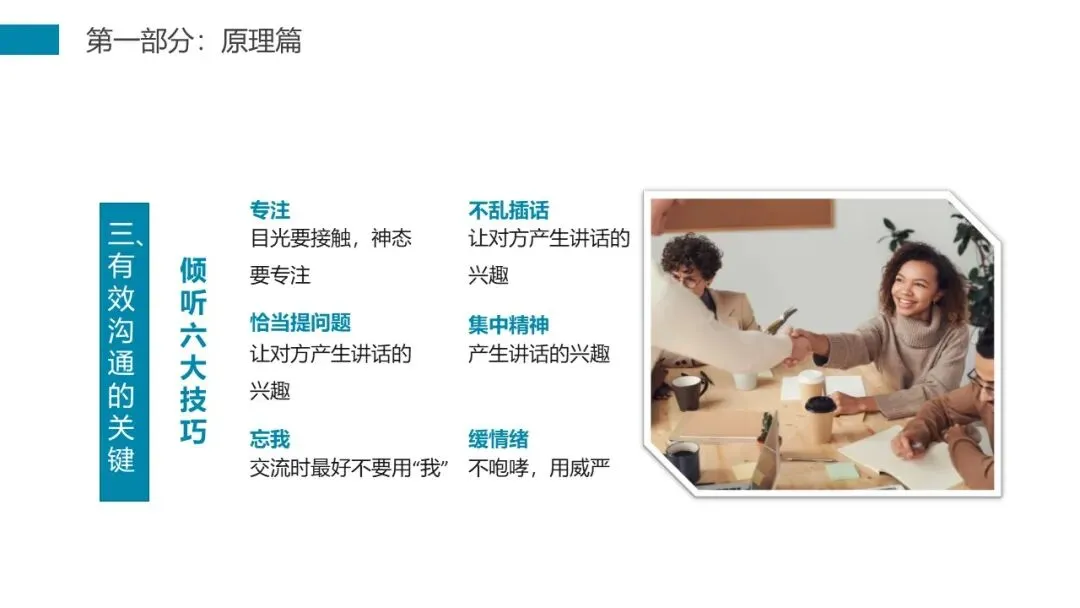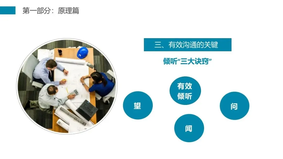 倾听的 “望、闻、问” 三大诀窍,更是让倾听更有价值:“望” 其神态动作,捕捉非语言信息;“闻” 其表达内容,理解核心诉求;“问” 其关键细节,确认信息偏差。