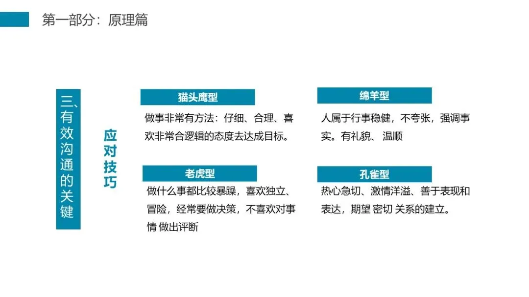 沟通的关键在于 “因人而异”,不同性格的人,有着不同的沟通偏好与行为特点,管理者要学会精准适配:面对绵羊型(温柔稳健、强调事实)的对象,沟通要沉稳务实,以数据和事实为依据;面对老虎型(果断强势、喜欢决策)的对象,沟通要简洁高效,直奔核心主题;面对孔雀型(热情外向、善于表现)的对象,沟通要多予肯定,营造轻松的交流氛围;面对猫头鹰型(严谨细致、注重逻辑)的对象,沟通要条理清晰,注重细节与逻辑。