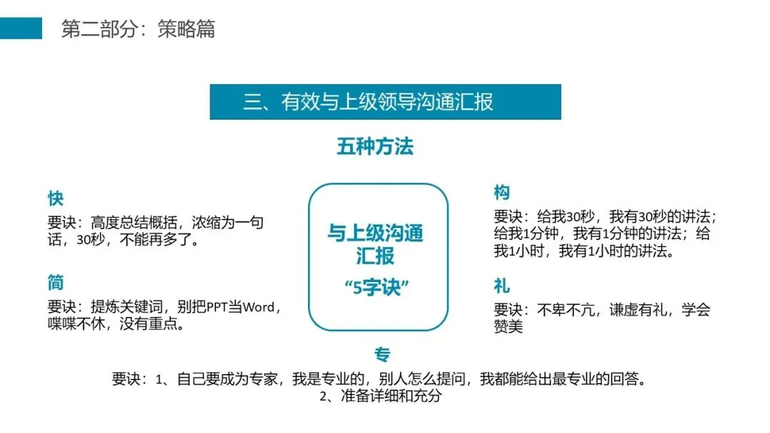 3. 五种方法:掌握快、构、简、礼、专五字诀,让汇报更出彩。快,高度总结概括,30 秒讲清核心内容;构,根据沟通时长搭建汇报框架,适配不同的沟通场景;简,提炼关键词,摒弃冗余信息,突出重点;礼,不卑不亢,谦虚有礼,学会适时赞美;专,成为业务专家,准备充分且详细,能精准回应上级的各类提问。