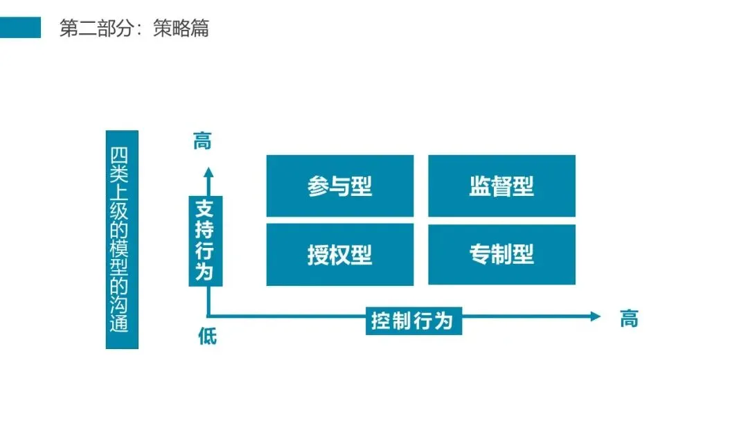 上级的管理风格不同,沟通方式也需灵活调整:面对专制型(高控制、低支持)上级,沟通要简洁明了,多做选择题、少做问答题;面对监督型(高控制、高支持)上级,沟通要及时汇报,主动同步工作细节;面对参与型(低控制、高支持)上级,沟通要多提想法,主动寻求建议;面对授权型(低控制、低支持)上级,沟通要抓大放小,重点汇报结果与关键节点。