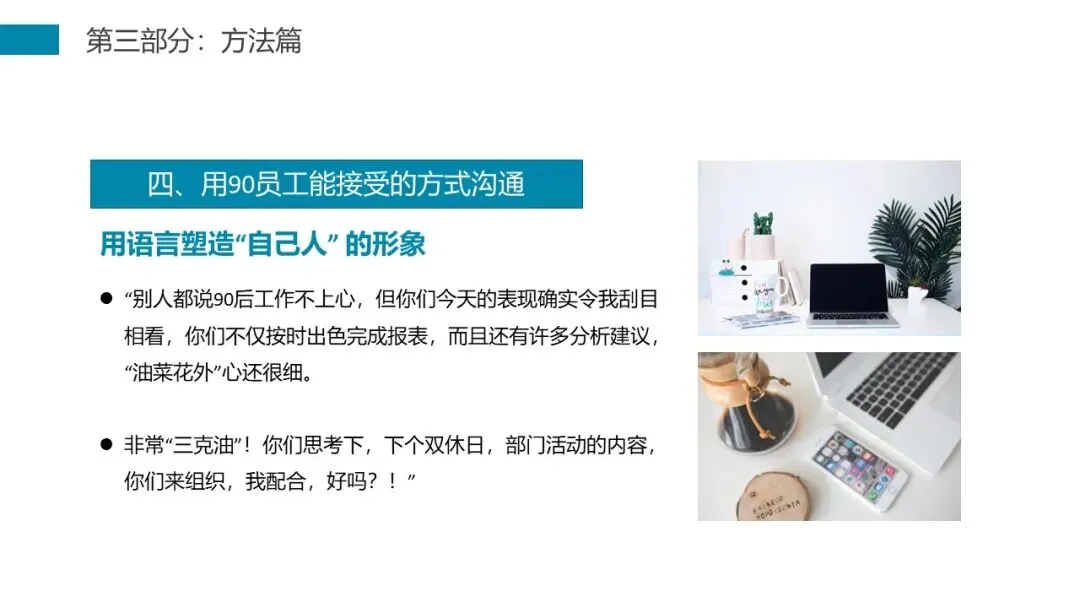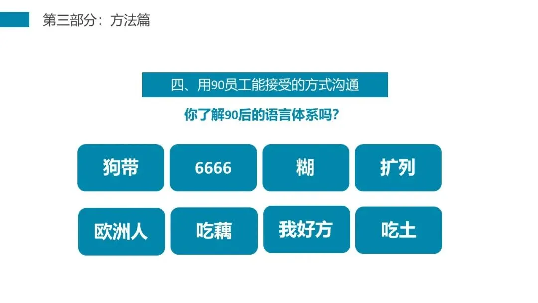 1. 融入他们的语言体系:适当使用新生代员工熟悉的网络用语,如 “666”“油菜花”“三克油” 等,拉近沟通距离,塑造 “自己人” 的形象,让沟通更轻松、更接地气。