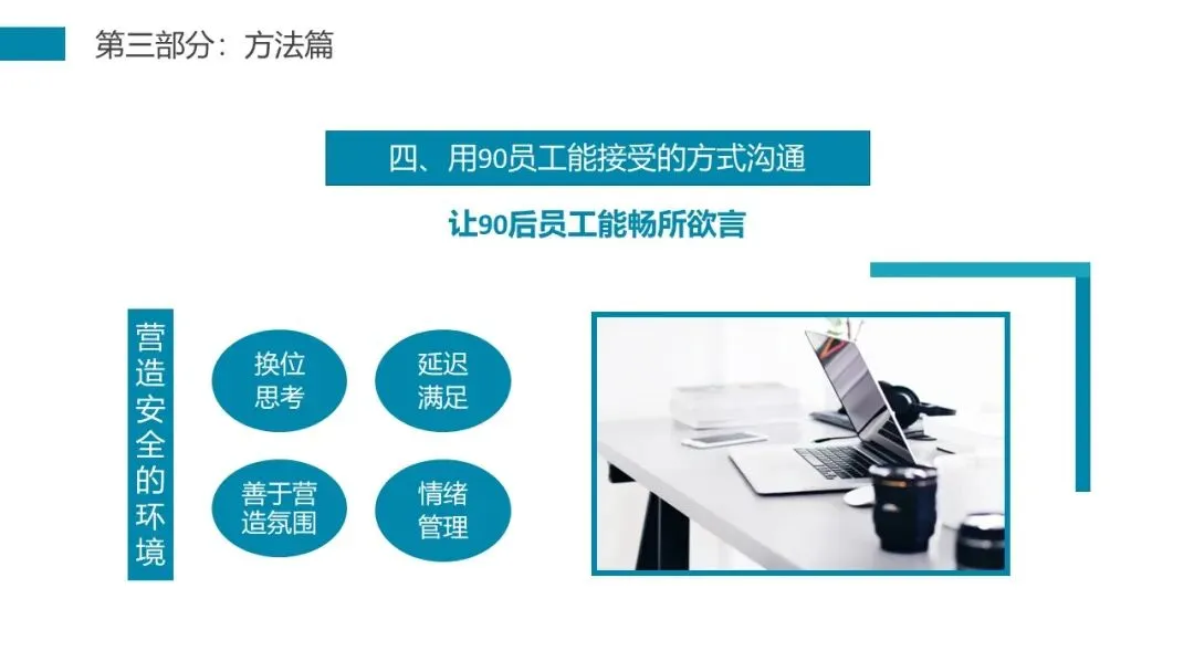 2. 营造安全的交流氛围:让员工畅所欲言,敢于表达想法、提出问题,甚至敢于反驳。沟通时学会换位思考,延迟情绪判断,不随意否定员工的想法,对不同意见给予尊重与回应。