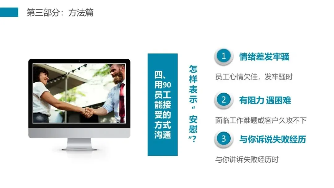 4. 做好情绪疏导与安慰:当员工情绪低落、发牢骚时,耐心倾听,给予情绪疏导;当员工工作遇到阻力、面临困难时,主动提供支持与帮助,而非指责批评;当员工诉说失败经历时,给予理解与鼓励,帮助其总结经验、重拾信心。