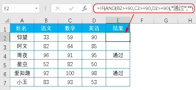 =IF(AND(B2>=90,C2>=90,D2>=90),"通过","")