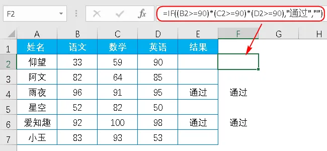 =IF((B2>=90)*(C2>=90)*(D2>=90),"通过","")