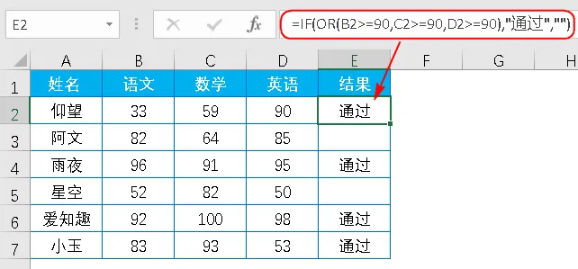 =IF(OR(B2>=90,C2>=90,D2>=90),"通过","")