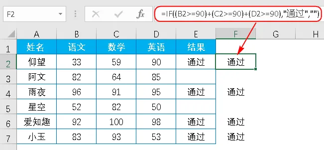 =IF((B2>=90)+(C2>=90)+(D2>=90),"通过","")