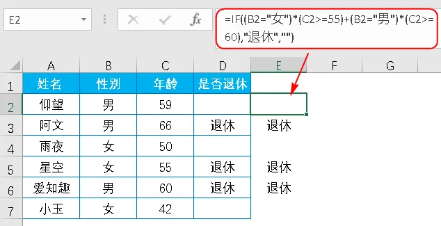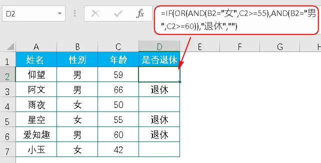 =IF(OR(AND(B2="女",C2>=55),AND(B2="男",C2>=60)),"退休","")