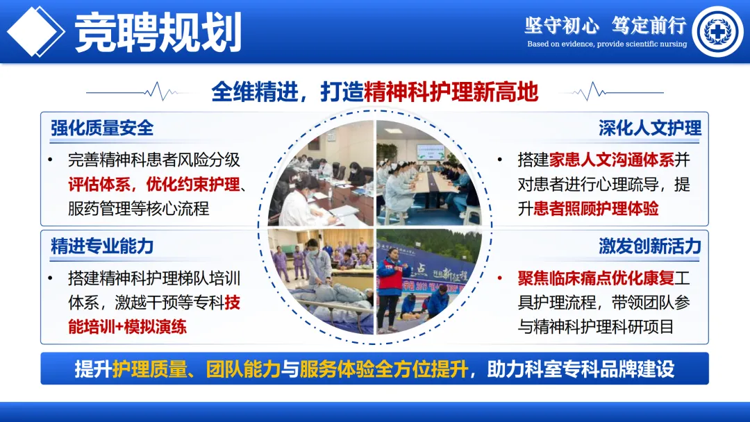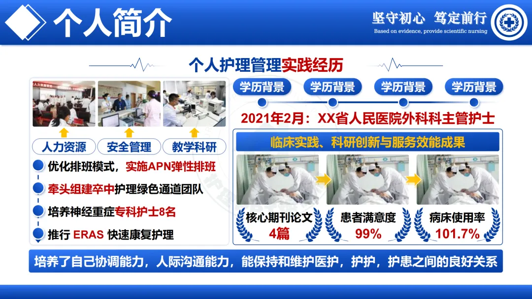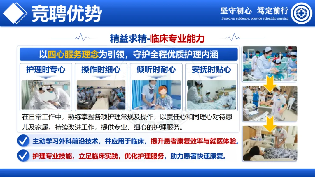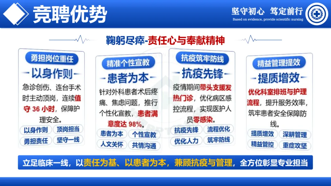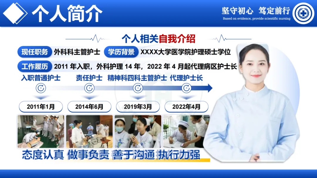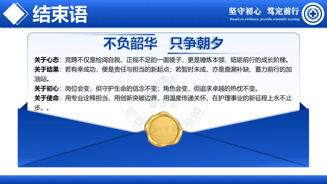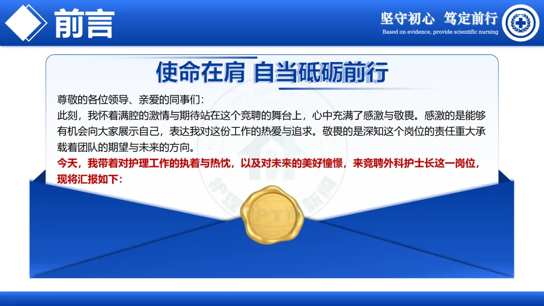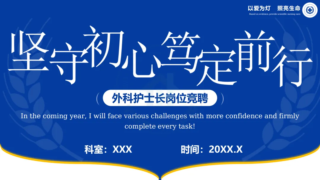 主题是“坚守初心,笃定前行”。竞聘外科护士长岗位,