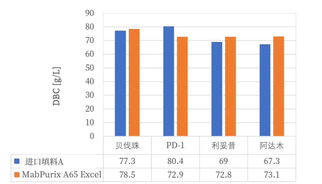 MabPurix A65 Excel具有与进口填料A相当的动态结合载量,且在具体的几款抗体类似药中的表现略佳于进口填料A。
