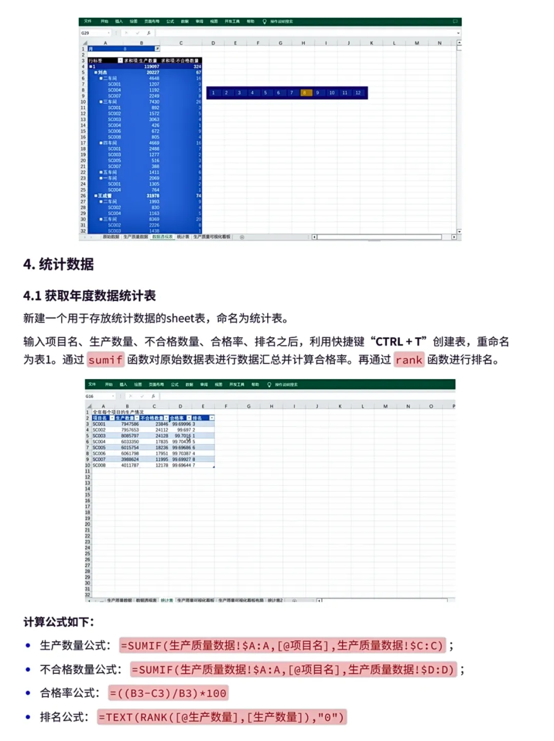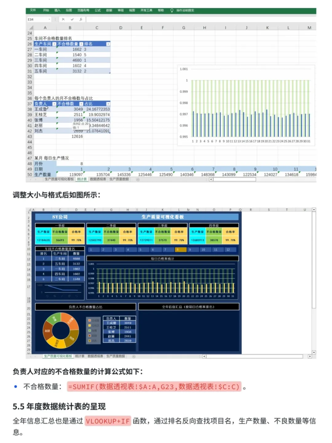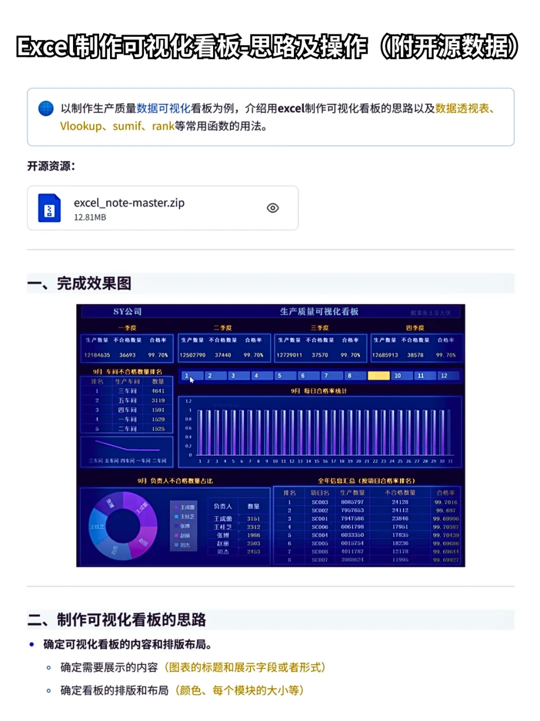 案例还介绍了用excel制作可视化看板的思路以及数据透视表、Vlookup、sumif、rank等常用函数的用法。