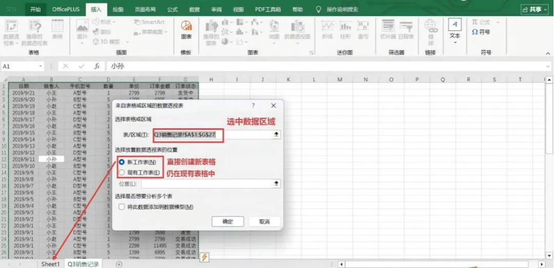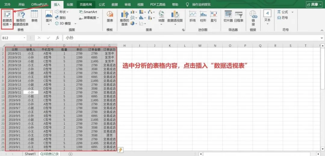 步骤2:制作数据透视表 选中发票表(含新增的两列),插入数据透视表: