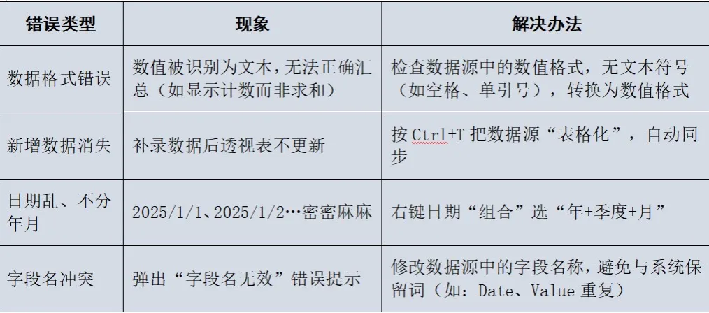 我们将数据透视表中一些常见的问题和解决办法整理为如下表格