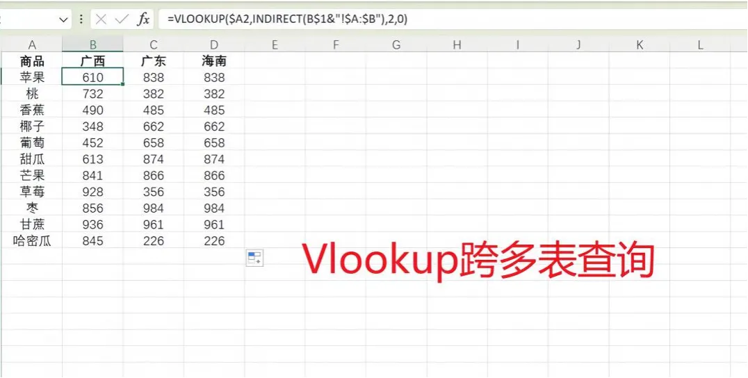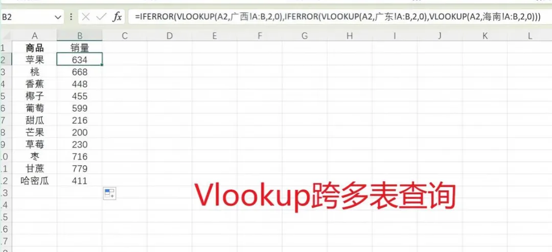 以水果销售表为例,共四张工作表,一张总表列有需查询的水果,用于检索目标数据;三张明细表(广西、广东、海南)则分别记录各地区不同水果的销量情况。在总表B列单元格中输入如下公式: