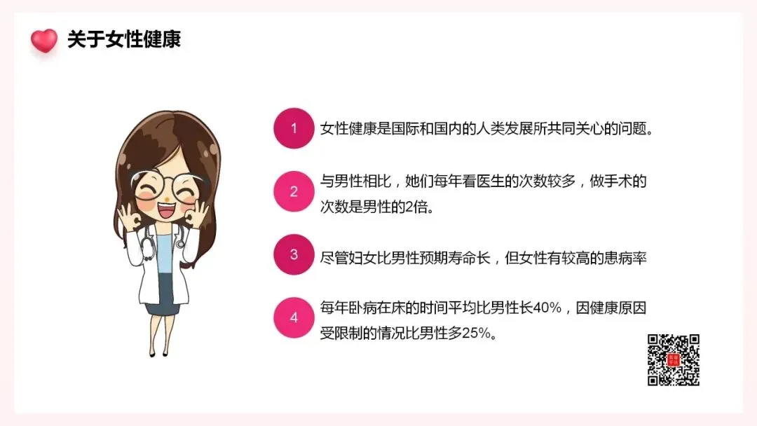 女性健康是国际和国内的人类发展所共同关心的问题。与男性相比,她们每年看医生的次数较多,做手术的次数是男性的2倍。尽管妇女比男性预期寿命长,但女性有较高的患病率