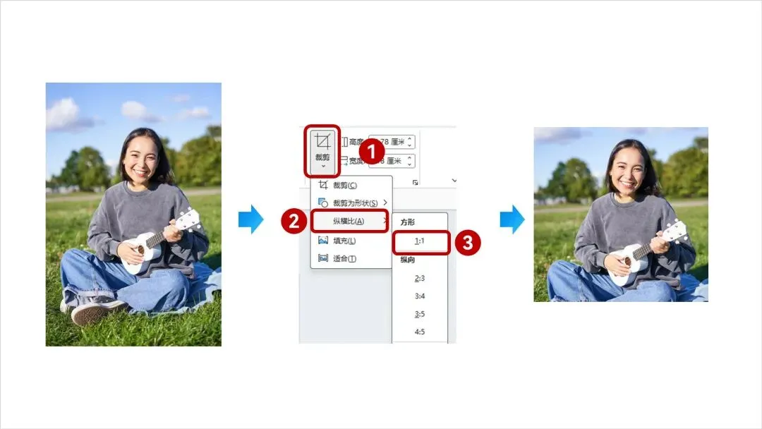 选中图片,点击【裁剪】-【纵横比】-【1:1】,将图片裁剪成1:1的比例。
