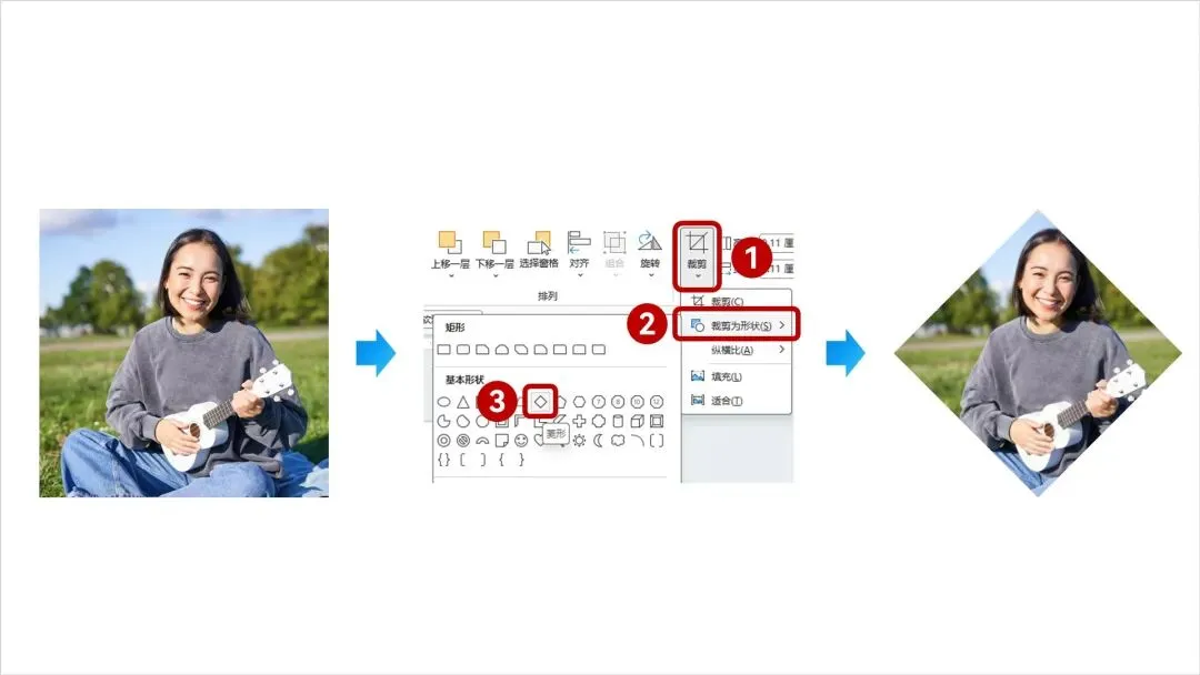 选中裁剪好比例的图片,点击【裁剪】-【裁剪为形状】-【菱形】。