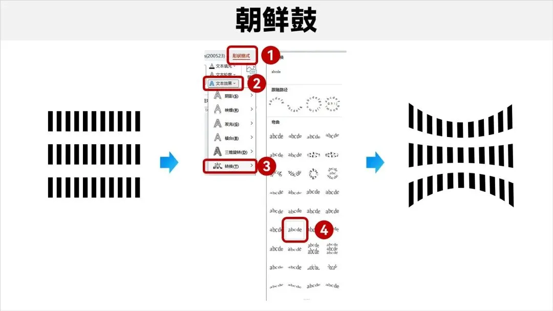 选中文本框,点击【形状格式】-【文本效果】-【转换】-【朝鲜鼓】。