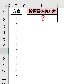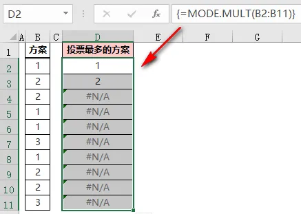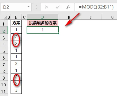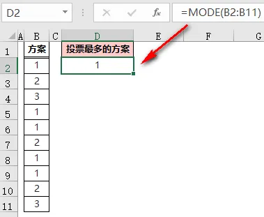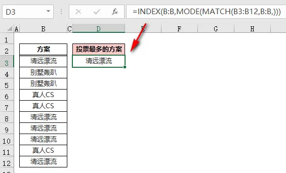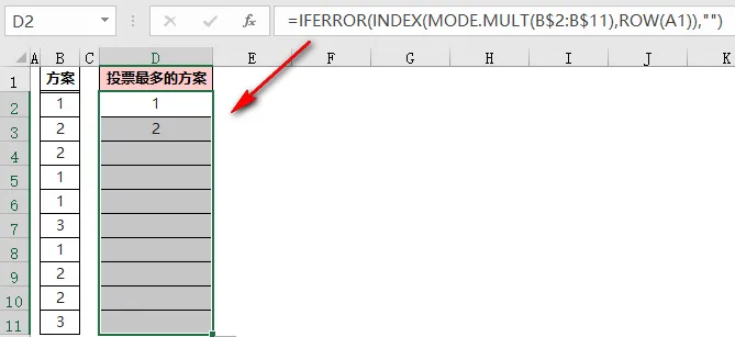 ❶ MODE.MULT(B$2:B$11)返回「B2:B11」区域中出现次数最多的值组成的垂直数组;本示例中出现次数最多的是 1 和 2,所以返回值是数组{1;2};❷ ROW(A1)是可变的,公式在 D2 单元格时,返回值是 1,当公式向下填充到 D3 单元格时,变为 ROW(A2),返回值是 2;❸ 然后用 INDEX 函数,返回数组{1;2}中 ROW(A1)函数指定的位置的值:D2 单元格返回数值的第一个值,即是 1,D2 单元格返回数值的第二个值,即为 2;❹ 最后用 IFERROR 函数屏蔽出现的错误值,如果有两个出现次数最多的数值,公式填充到第 2、第 3……第 n 行,也不会出现错误值。不知大家注意到了没有,上面所讲的都是对出现次数最多的数值进行统计。如下图,B 列的每行内容都是文本,怎么求出投票最多的方案呢?这时候,需要先通过 MATCH 函数找到每个数据的位置转化为数值,然后利用 MODE 函数求出出现次数最多的方案;=INDEX(B:B,MODE(MATCH(B3:B12,B:B,)))
