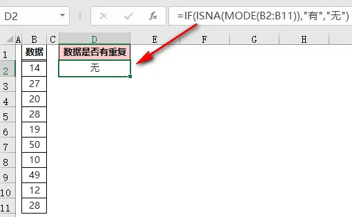 另外,MODE 函数有个特性,如果参数中没有重复的数字,即全部数字出现且仅出现一次,则 MODE 函数会返回错误值#N/A。如下图,如何利用 MODE 函数判断 B 列中的这组数据是否有重复?=IF(ISNA(MODE(B2:B11)),"有","无")
