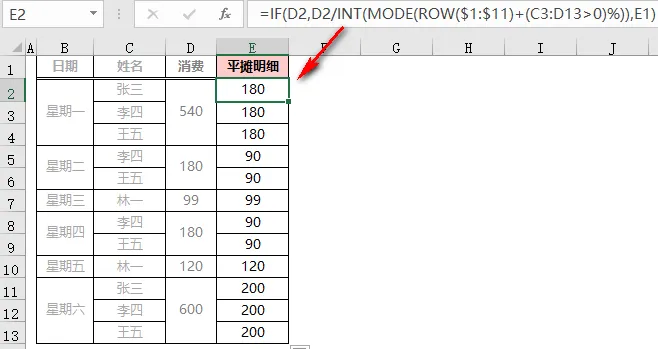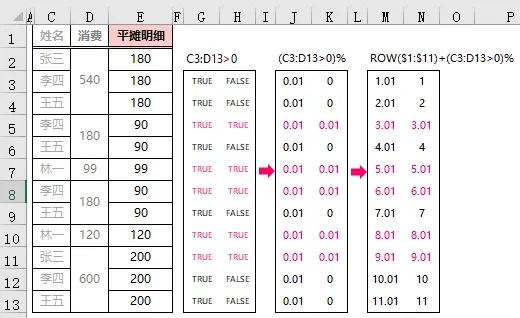 ❹ INT(MODE(ROW($1:$11)+(C3:D13>0)%))从生成的数组结果中可以看出,相同的数字最多出现两次,用 MODE 函数返回出现次数最多的第一个数值,即是 3.01,然后用 INT 函数取整,就是当前参与消费的人数;❺最后用 IF 函数判断,当 D 列单元格不为空时,用消费金额除以人数,即为分摊金额;否则返回 E 列上一行的金额。